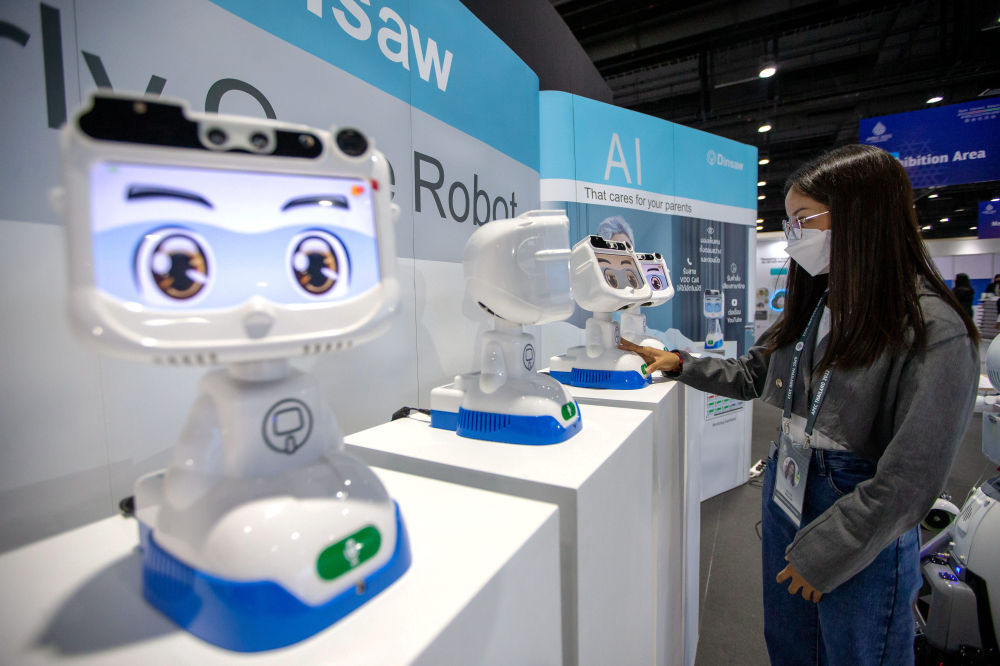 11月14日,在泰國首都曼谷,工作人員在APEC會議媒體中心與機器人互動。新華社記者 王騰 攝