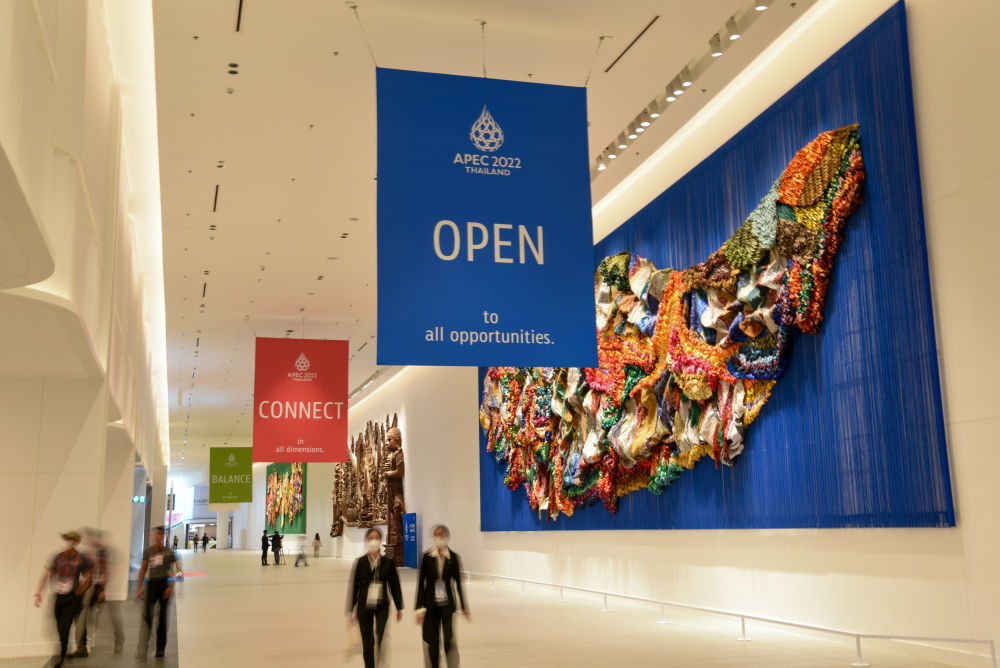 曼谷商業(yè)區(qū)的詩麗吉王后國家會(huì)議中心是亞太經(jīng)合組織第二十九次領(lǐng)導(dǎo)人非正式會(huì)議主會(huì)場,藍(lán)、紅、綠三色標(biāo)語格外醒目,組成這次會(huì)議的主題“開放、聯(lián)通、平衡”。