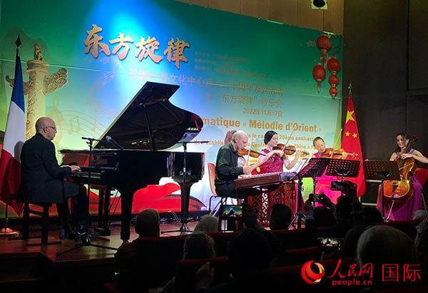 人民網(wǎng)巴黎11月17日電 (記者劉玲玲)17日晚,由中國對外文化交流協(xié)會主辦,巴黎中國文化中心、中國歌劇舞劇院承辦的“東方旋律”音樂會在法國巴黎舉行。中國駐法國大使盧沙野、法國新里昂中法大學(xué)副主席阿蘭·拉巴特等出席活動并致辭。來自中法各界200余人現(xiàn)場觀看了音樂會。音樂家尚·馬龍、左漢與藝韻女子弦樂四重奏樂團(tuán)為觀眾現(xiàn)場演繹了《東方旋律》《莫扎特:G大調(diào)弦樂小夜曲》《茉莉花》等中外名曲,為觀眾奉獻(xiàn)了一場東西方音樂交融、經(jīng)典與時代輝映的藝術(shù)盛宴。