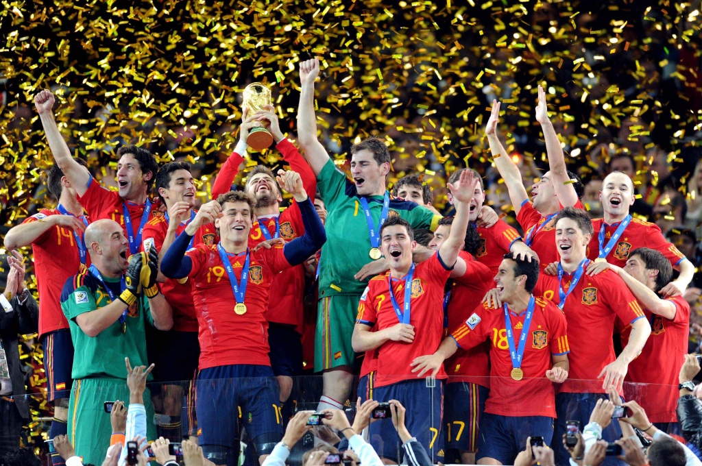 ↑2010年7月11日,西班牙隊(duì)在南非世界杯上捧得大力神杯。新華社記者郭勇攝