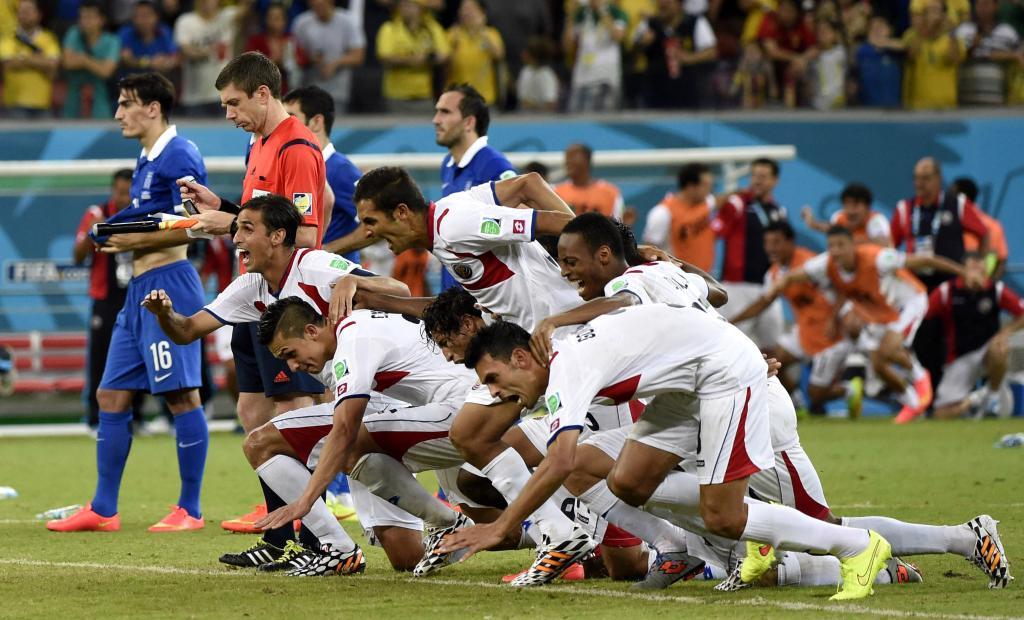 ↓2014年6月29日,哥斯達(dá)黎加在巴西世界杯八分之一決賽中點(diǎn)球戰(zhàn)勝希臘隊(duì)。新華社記者呂小煒攝