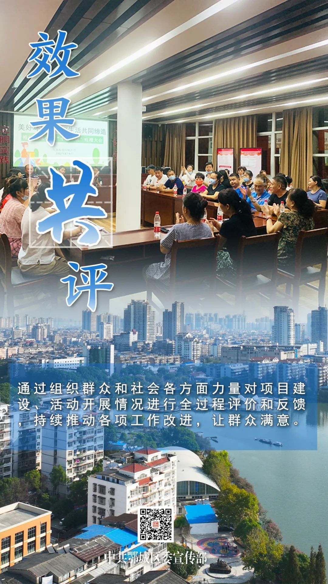 效果共評(píng):通過(guò)組織群眾和社會(huì)各方面力量對(duì)項(xiàng)目建設(shè)、活動(dòng)開(kāi)展情況進(jìn)行全過(guò)程評(píng)價(jià)和反饋,持續(xù)推動(dòng)各項(xiàng)工作改進(jìn),讓群眾滿意。