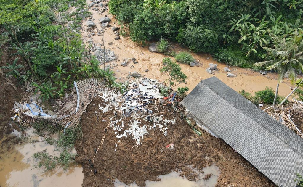 11月22日,救援人員在印度尼西亞西爪哇省展玉地區(qū)地震震中附近的山體滑坡現(xiàn)場開展救援(無人機(jī)照片)。新華社記者徐欽攝