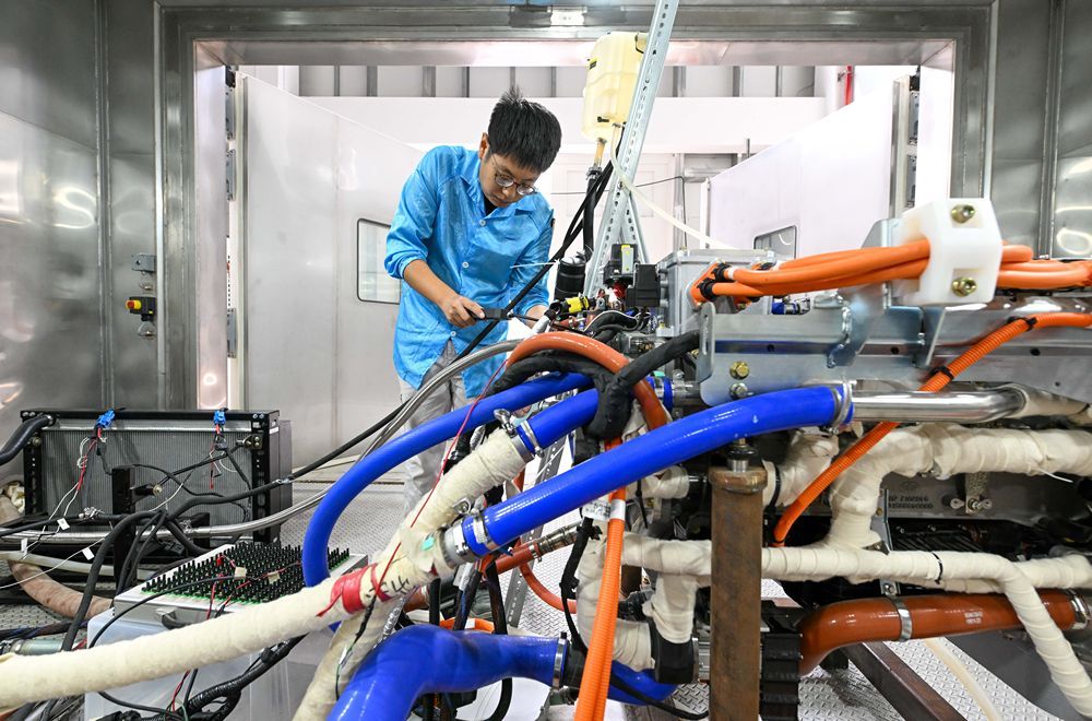 9月14日,在中汽中心新能源汽車科技創(chuàng)新基地燃料電池部,工作人員準(zhǔn)備進(jìn)行氫燃料電池發(fā)動(dòng)機(jī)環(huán)境適應(yīng)性試驗(yàn)。新華社記者孫凡越攝