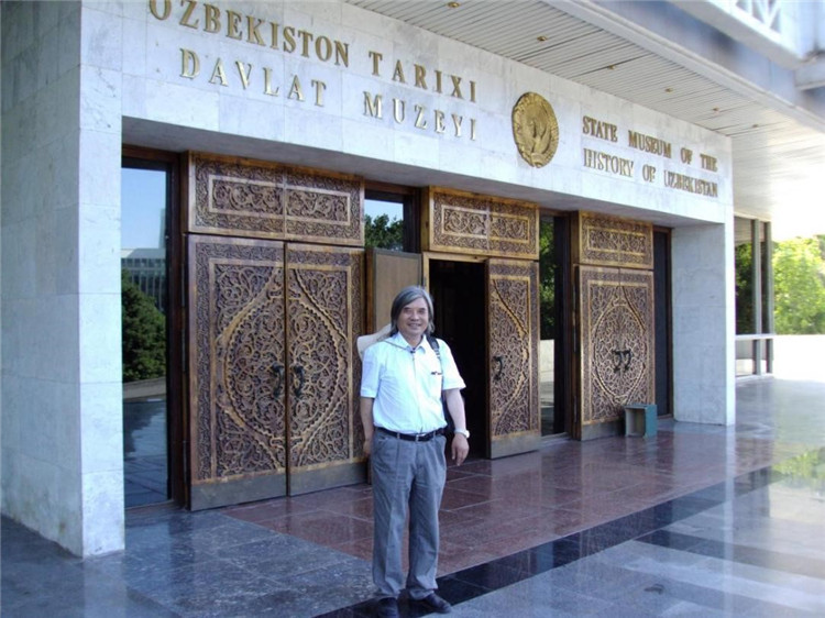 2009年,王建新第一次到達烏茲別克斯坦,在烏國家歷史博物館門前拍照留念。王新建團隊供圖