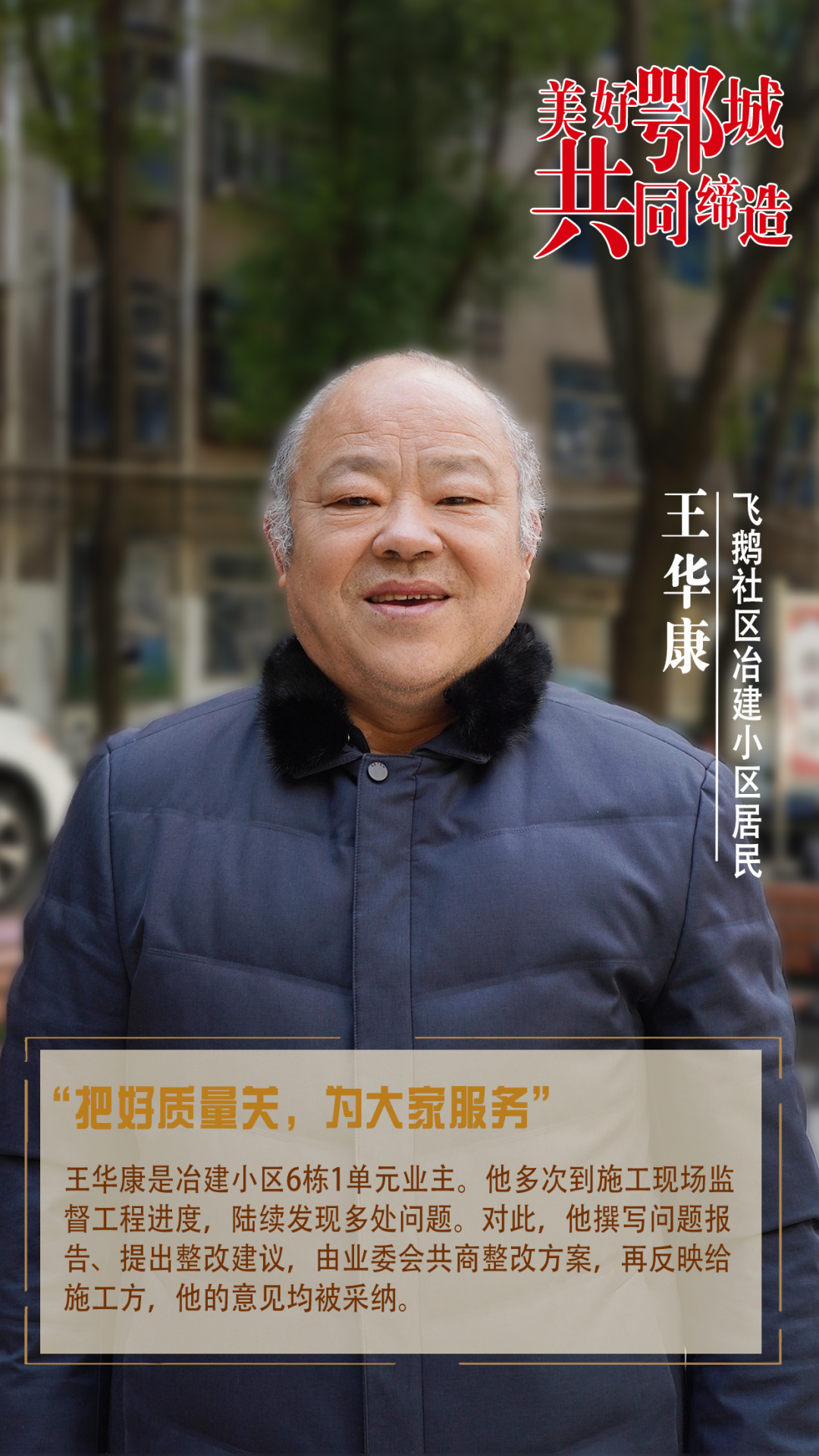 王華康是冶建小區(qū)6棟1單元業(yè)主。他多次到施工現(xiàn)場監(jiān)督工程進度,陸續(xù)發(fā)現(xiàn)多處問題。對此,他撰寫問題報告、提出整改建議,由業(yè)委會共商整改方案,再反映給施工方,他的意見均被采納。