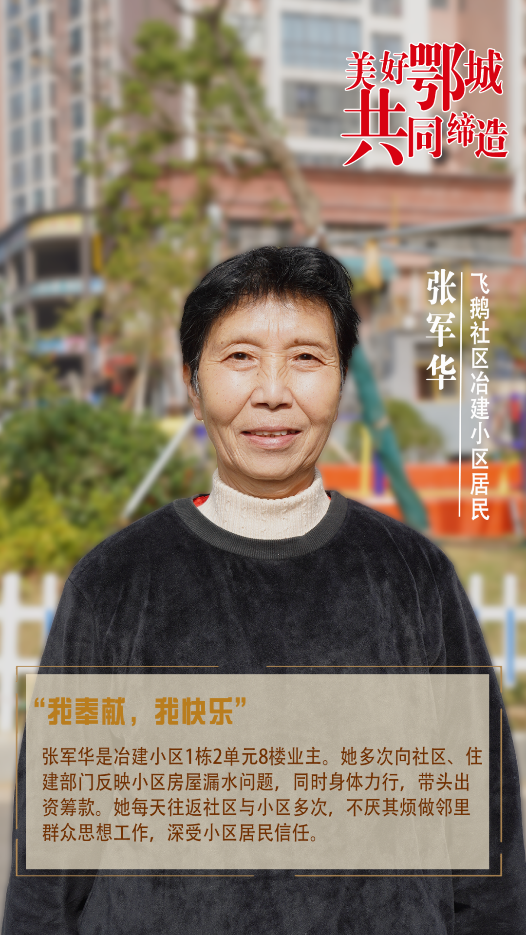 張軍華是冶建小區(qū)1棟2單元8樓業(yè)主。她多次向社區(qū)、住建部門反映小區(qū)房屋漏水問題,同時身體力行,帶頭出資籌款。她每天往返社區(qū)與小區(qū)多次,不厭其煩做鄰里群眾思想工作,深受小區(qū)居民信任。