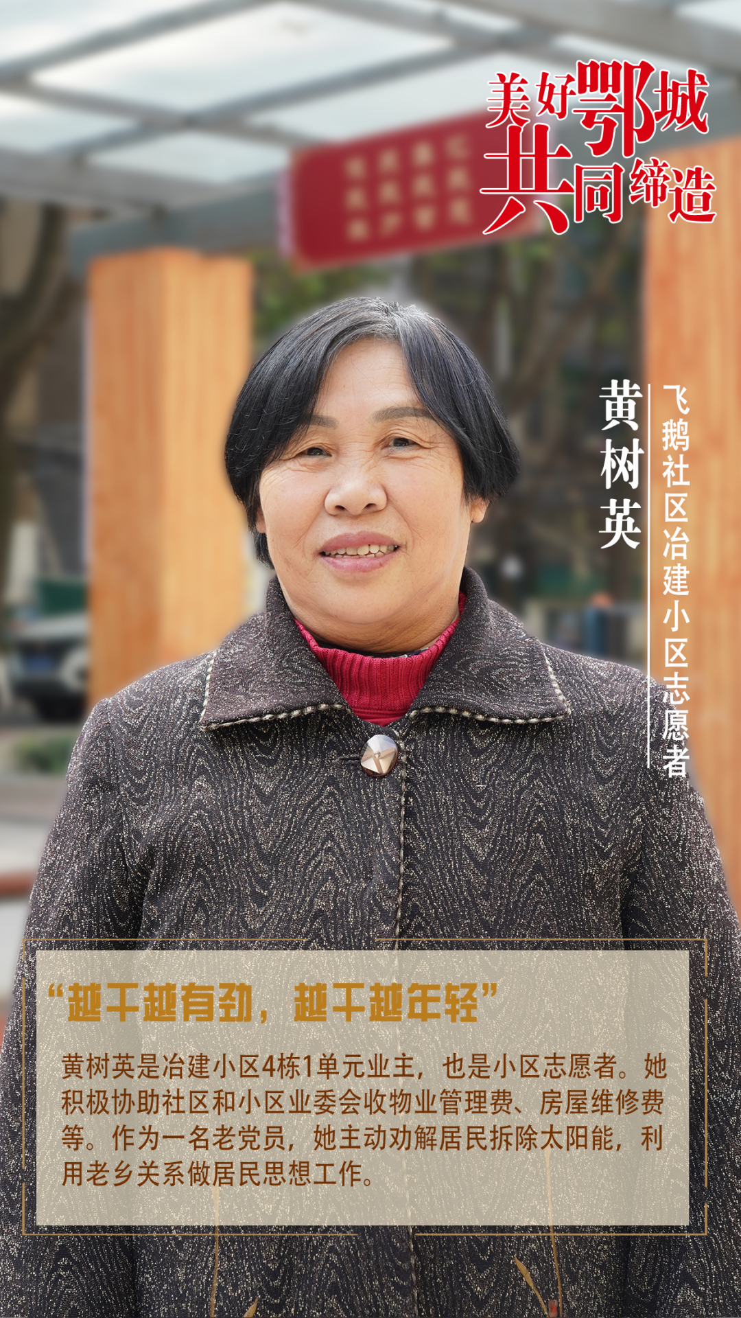 黃樹英是冶建小區(qū)4棟1單元業(yè)主,也是小區(qū)志愿者。她積極協(xié)助社區(qū)和小區(qū)業(yè)委會收物業(yè)管理費、房屋維修費等。作為一名老黨員,她主動勸解居民拆除太陽能,利用老鄉(xiāng)關系做居民思想工作。