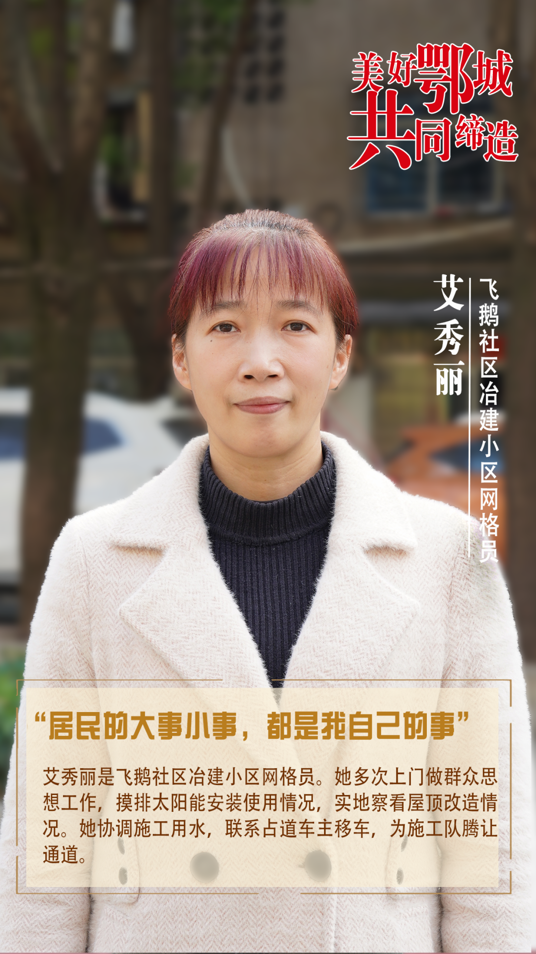 艾秀麗是飛鵝社區(qū)冶建小區(qū)網格員。她多次上門做群眾思想工作,摸排太陽能安裝使用情況,實地察看屋頂改造情況。她協(xié)調施工用水,聯(lián)系占道車主移車,為施工隊騰讓通道。