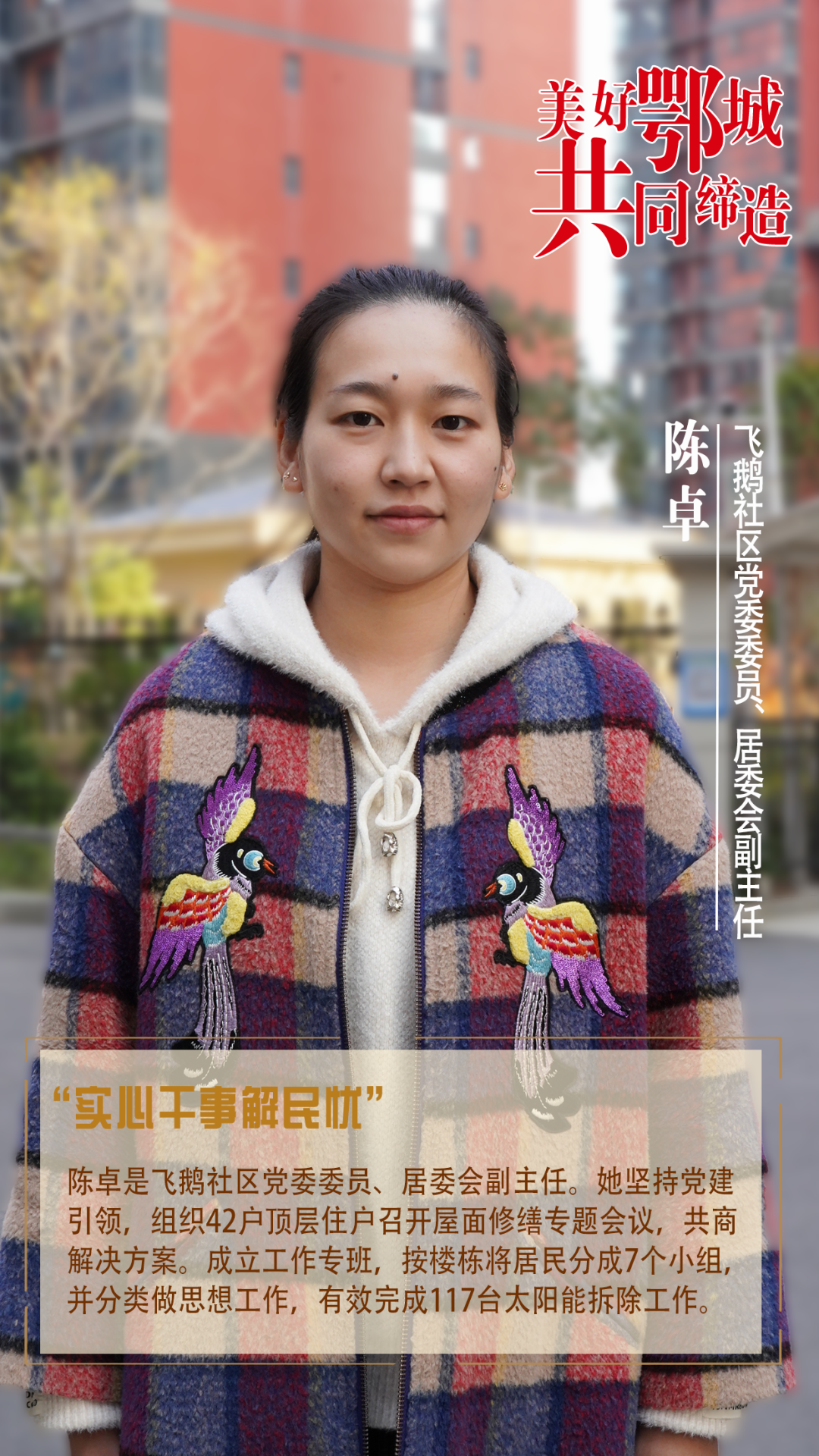 陳卓是飛鵝社區(qū)黨委委員、居委會副主任。她堅持黨建引領,組織42戶頂層住戶召開屋面修繕專題會議,共商解決方案。成立工作專班,按樓棟將居民分成7個小組,并分類做思想工作,有效完成117臺太陽能拆除工作。