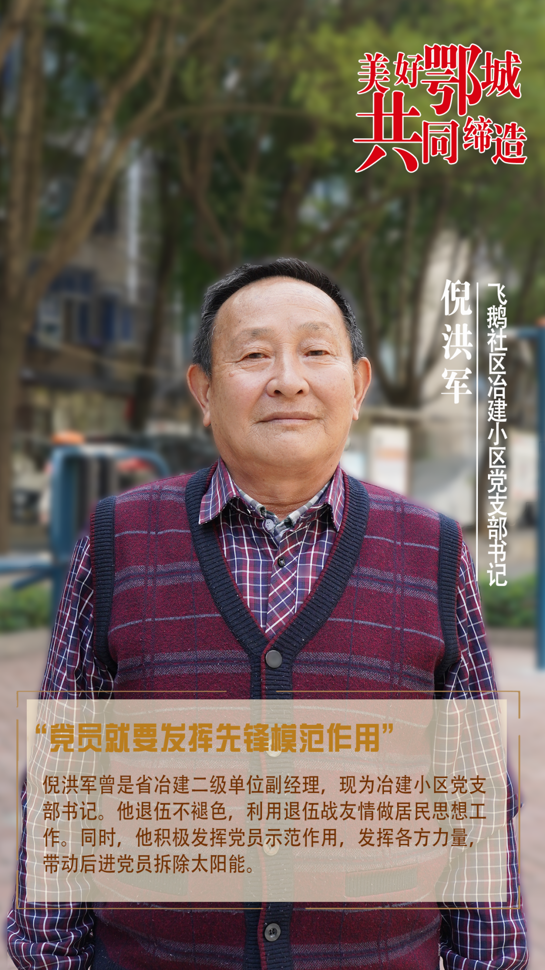 倪洪軍曾是省冶建二級單位副經理,現(xiàn)為冶建小區(qū)黨支部書記。他退伍不褪色,利用退伍戰(zhàn)友情做居民思想工作。同時,他積極發(fā)揮黨員示范作用,發(fā)揮各方力量,帶動后進黨員拆除太陽能。