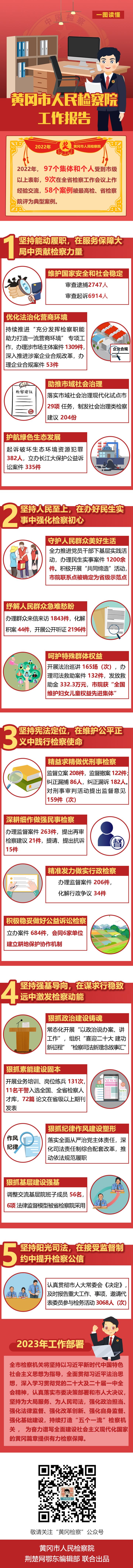 1月5日,黃岡市第六屆人民代表大會第二次會議開幕,黃岡市人民檢察院黨組書記、檢察長萬強向大會作《黃岡市人民檢察院工作報告》。2022年,黃岡市人民檢察院工作成效如何?2023年,有哪些工作部署?荊楚網(wǎng)(湖北日報網(wǎng))帶您一圖讀懂。