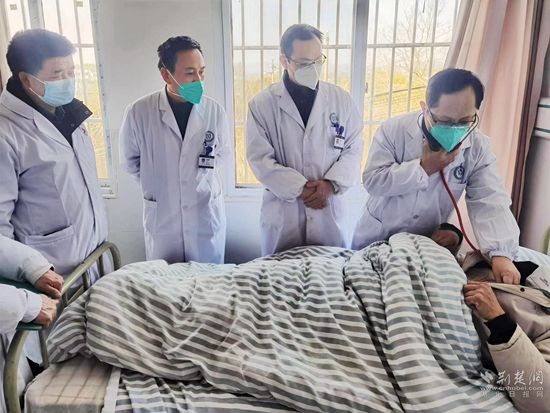 荊楚網(湖北日報網)訊(通訊員程曉林 李 勇 饒國健)1月6日下午4時10分,在浠水縣綠楊鄉(xiāng)衛(wèi)生院三樓住院部病房里,浠水縣人民醫(yī)院副院長、主任醫(yī)師黃大雄帶領該院第5醫(yī)療救治專家組主任醫(yī)師付鴻鷹、副主任醫(yī)師柴小利同綠楊衛(wèi)生院醫(yī)務人員一起,給82歲的新冠感染患者張鳳銀婆婆進行會診。