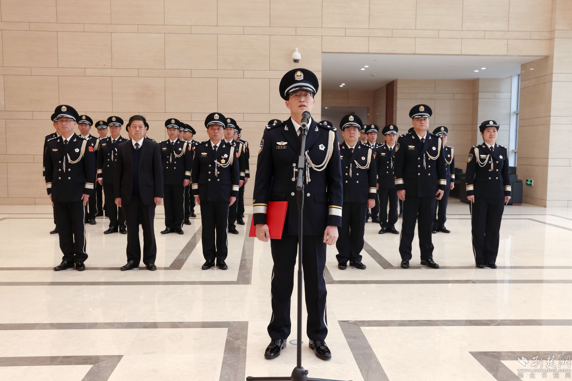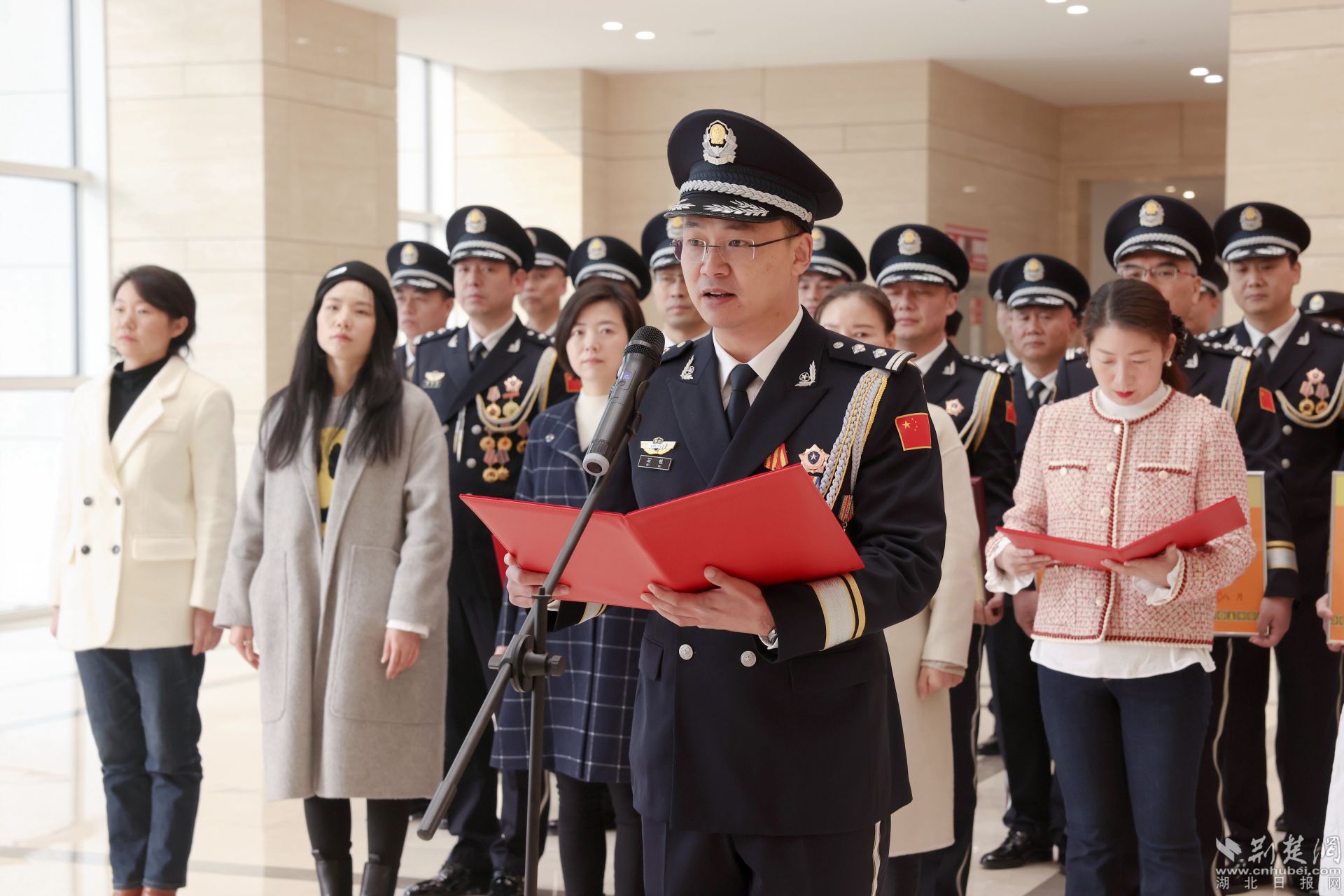 飄揚(yáng)的警旗下,黃石市副市長(zhǎng)、市公安局黨委書(shū)記、局長(zhǎng)黃志勇帶領(lǐng)大家重溫入警誓詞:“我是中國(guó)人民警察,我宣誓……”全體民警高舉右臂,緊握右拳,鏗鏘有力的話(huà)語(yǔ)表達(dá)對(duì)公安事業(yè)的無(wú)限熱愛(ài)。