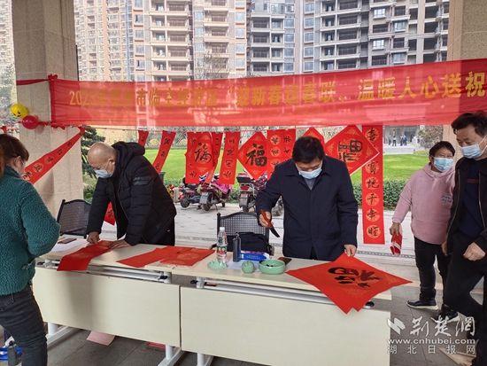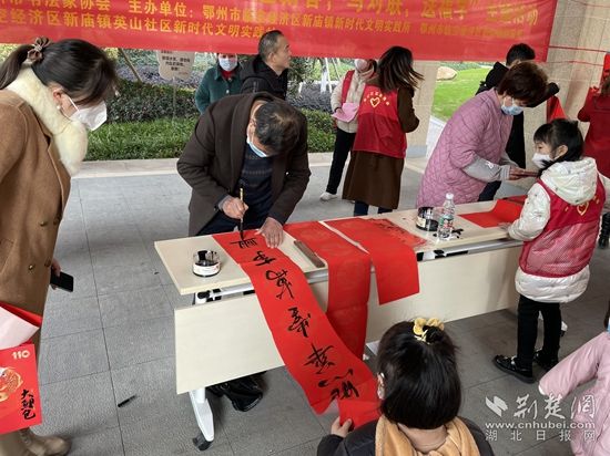 在銀海龍辰小區(qū),來自鄂州市書法協(xié)會的各位書法家現(xiàn)場“揮毫潑墨”,應(yīng)小區(qū)居民的要求,現(xiàn)場書寫春聯(lián)和“?!弊?。此次活動,共計為居民書寫贈送160副春聯(lián)、100幅“?!弊帧?/p>
