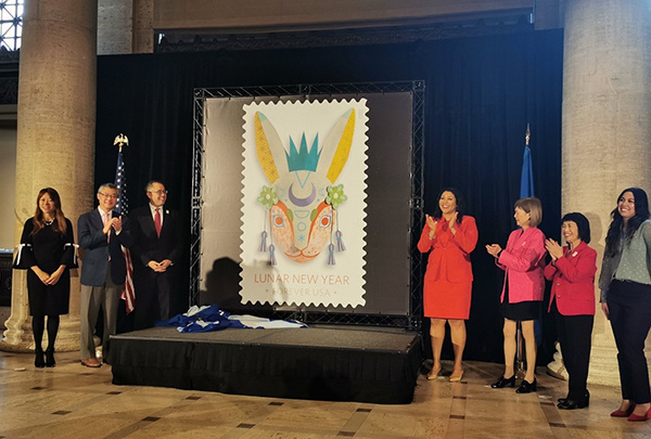 美國(guó)郵政總局在舊金山亞洲藝術(shù)博物館舉行中國(guó)農(nóng)歷兔年紀(jì)念郵票發(fā)行儀式。主辦方供圖