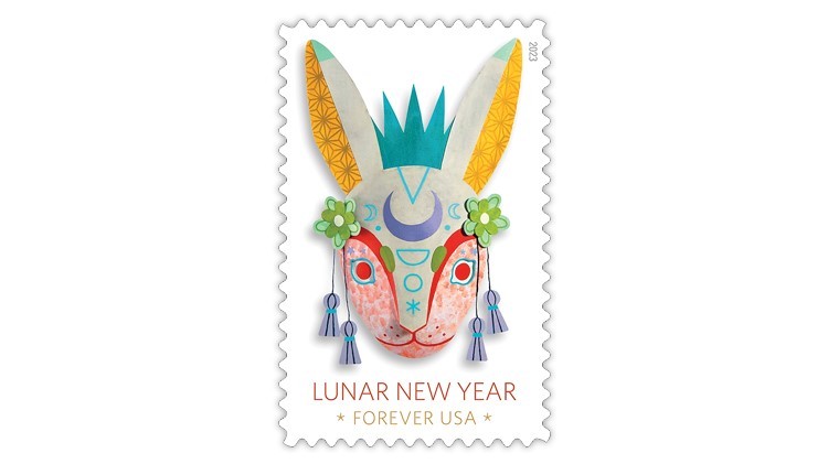 郵票上的小兔在兩只高聳的耳朵之間露出一頂綠色的王冠,額頭兩側(cè)的綠花上垂下四根紫色的流蘇,與前3年郵票上的流蘇一致。 從額頭到鼻梁的幾何圖形包括綠色的月亮和星星,讓熟悉中國(guó)文化的人很快想起民間傳說(shuō)中月宮里的玉兔。美國(guó)郵政稱贊此款郵票:“使用傳統(tǒng)民間剪紙工藝對(duì)一年中這個(gè)吉時(shí)的當(dāng)代詮釋”。
