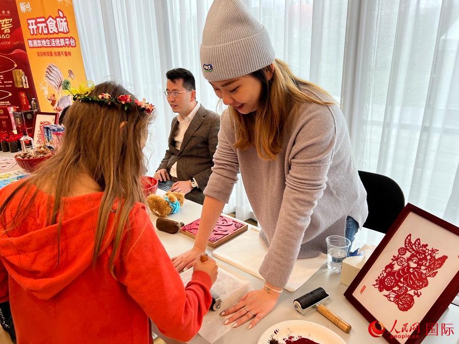 | 當(dāng)?shù)匦∨笥洋w驗(yàn)傳統(tǒng)拓印。人民網(wǎng)記者 李強(qiáng)攝 |