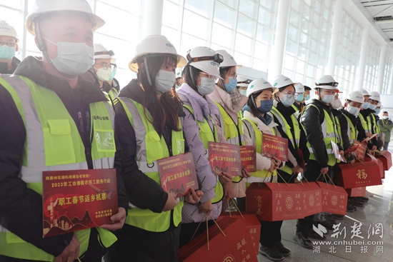 今年送你們回家過春節(jié),明年將再一次迎接你們回來,繼續(xù)建設、發(fā)展、運營花湖機場,花湖機場因你們而驕傲,將來你們也一定會因花湖機場而驕傲?!痹诂F(xiàn)場,鄂州市委常委、統(tǒng)戰(zhàn)部部長、市總工會主席夏帆對機場建設者代表說。