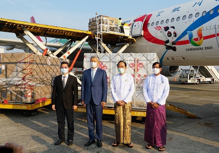 陳海大使在交接儀式上說,中緬兩國山水相連,胞波情誼源遠(yuǎn)流長。緬方提出希望中方援助新一批疫苗后中方迅速響應(yīng),克服航班緊張困難第一時(shí)間發(fā)運(yùn)疫苗。這批300萬劑新冠疫苗主要用于學(xué)齡兒童加強(qiáng)針接種。中國始終堅(jiān)持人民至上生命至上,已為14億人口接種了超過34億劑新冠疫苗,經(jīng)受住了全球疫情多次沖擊,保持了全球最低感染率和死亡率。不久前中國主動調(diào)整疫情防控措施,既最大程度保護(hù)人民生命安全和身體健康,又最大限度減小疫情對經(jīng)濟(jì)社會發(fā)展的影響。事實(shí)證明中國防疫政策調(diào)整科學(xué)、安全、有效,經(jīng)濟(jì)和社會活力進(jìn)一步釋放,將進(jìn)一步展現(xiàn)世界經(jīng)濟(jì)復(fù)蘇“穩(wěn)定器”和“發(fā)動機(jī)”作用。未來中方將繼續(xù)深化與緬方各領(lǐng)域合作,促進(jìn)緬甸經(jīng)濟(jì)社會發(fā)展與民生改善,推動共建中緬命運(yùn)共同體進(jìn)程。