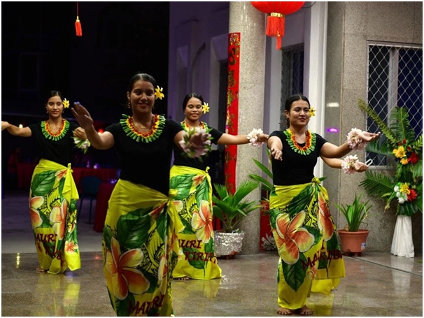 基里巴斯青年學(xué)生表演當(dāng)?shù)靥厣璧?。駐基里巴斯大使館供圖
