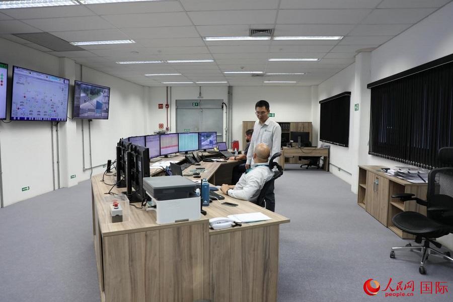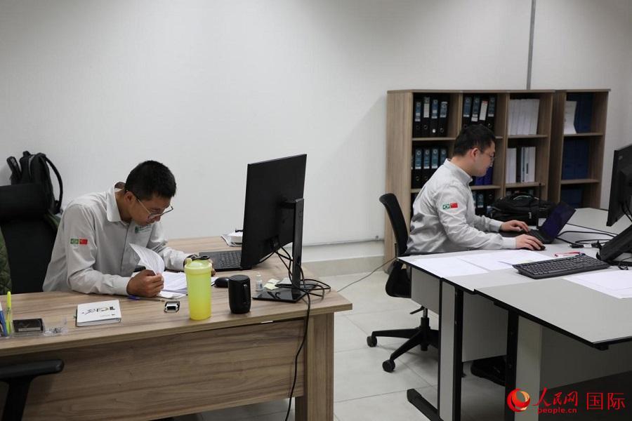 運(yùn)維主管許鴻飛在里約換流站的日常工作是巡視大型設(shè)備的運(yùn)維進(jìn)展、查看設(shè)備運(yùn)營狀況,以及與巴西員工交流運(yùn)行維護(hù)信息、向巴西控股公司總部作匯報。圖為徐鴻飛在集控室里與巴西員工交流設(shè)備運(yùn)維情況。 人民網(wǎng)記者 陳一鳴攝