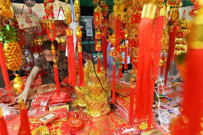 1月16日,一名商販在泰國(guó)曼谷唐人街的攤位上擺放春節(jié)飾品。新華社發(fā)(拉亨攝)
