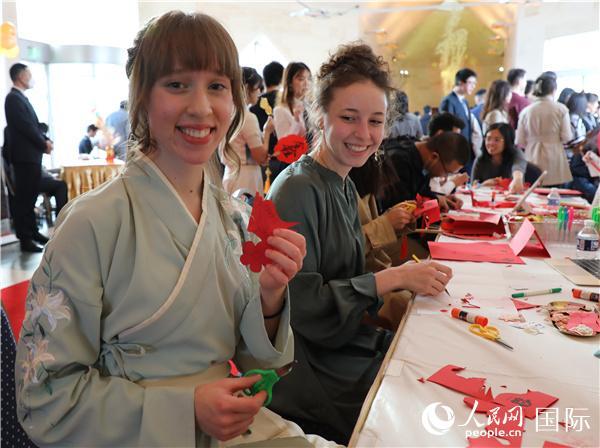 | 當?shù)卮髮W(xué)生體驗中國剪紙。人民網(wǎng)記者 李志偉攝 |