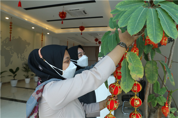 為了讓中印尼員工一起度過一個(gè)歡樂祥和的春節(jié),印尼爪哇公司早早就開始準(zhǔn)備過年的各項(xiàng)活動(dòng),農(nóng)歷二十八這天一大早,各個(gè)單位就開始張羅著掛對(duì)聯(lián)、貼福字、掛燈籠……節(jié)日歡快的歌聲傳遍現(xiàn)場(chǎng)每一個(gè)角落,紅紅火火的節(jié)日氛圍立即拉滿,現(xiàn)場(chǎng)充滿喜慶的紅色——這是中印尼兩國(guó)人民共同喜愛的顏色。