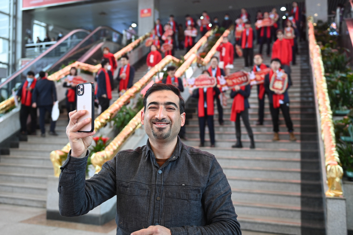 2月2日,來自伊拉克的客商拉伊德在義烏國際商貿(mào)城的大廳觀看開市文藝表演節(jié)目。圖片來源:新華社