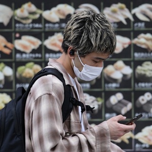 2020年5月4日,在日本東京,戴口罩的行人從壽司店前經(jīng)過。新華社記者杜瀟逸攝