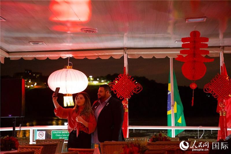 | 巴西民眾在節(jié)日裝扮的游船上合影慶元宵。人民網(wǎng)記者 畢夢瀛攝 |