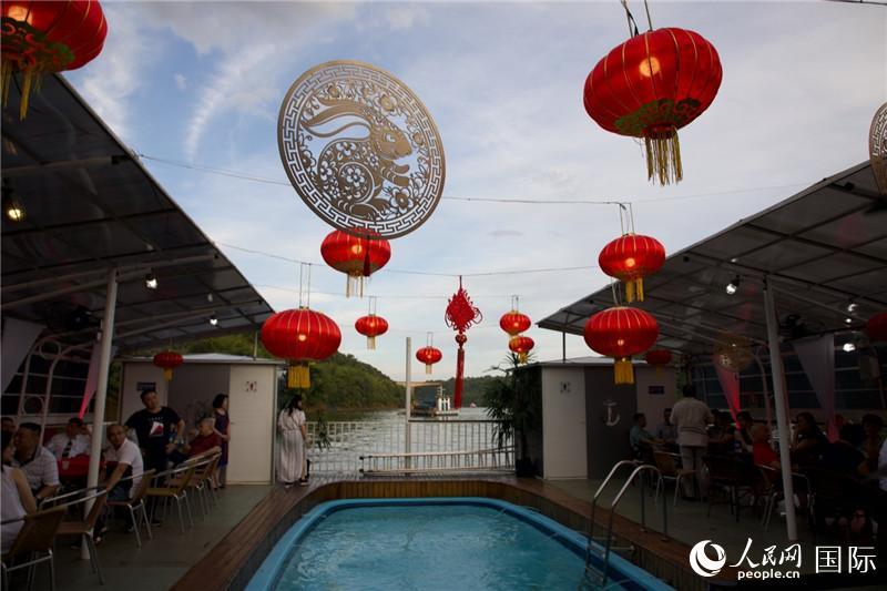 人民網(wǎng)伊瓜蘇2月5日電 (記者畢夢瀛)當(dāng)?shù)貢r間2月5日,在巴西南部著名旅游城市伊瓜蘇,掛滿紅燈、中國結(jié)等裝飾的游船緩緩行駛在巴拉那河上。伴隨著悠揚的歌聲和熱情的巴西舞蹈,中巴友人一同品嘗著湯圓,為伊瓜蘇元宵節(jié)系列慶?;顒赢嬌狭司涮?。