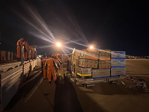 當?shù)貢r間2月8日凌晨4點30分(北京時間9時30分),中國救援隊一行82人經(jīng)過約10小時的飛行,抵達土耳其阿達納機場。隊長趙明介紹,根據(jù)當?shù)貙嶋H情況,中國救援隊立即開展卸貨轉(zhuǎn)運工作,盡快做好與我駐土耳其使館、當?shù)卣?、?lián)合國有關機構(gòu)對接,結(jié)合目前救援進展情況,接領具體搜救行動任務,并擬派出救援小隊對執(zhí)行任務場地進行實地勘查,同時選擇安全合適的位置搭建營地。