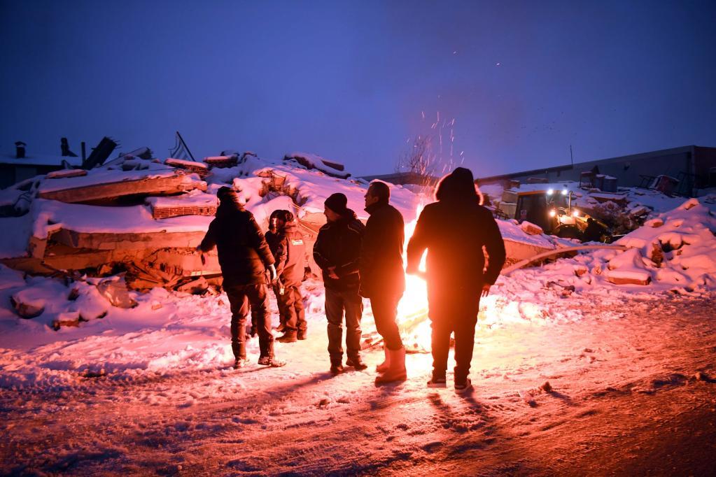 2月7日晚,在土耳其卡赫拉曼馬拉什省南部的埃爾比斯坦地區(qū),救援人員在廢墟旁燒火取暖。新華社記者沙達提攝