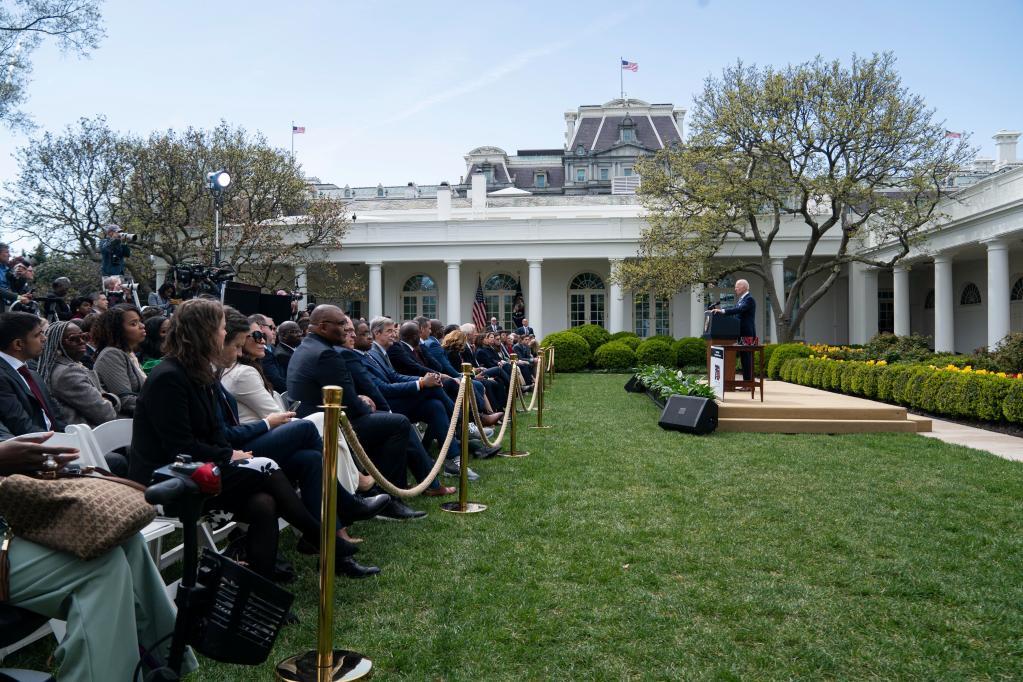 2022年4月11日,美國(guó)總統(tǒng)拜登(右一)在華盛頓白宮就監(jiān)管“幽靈槍”的新規(guī)發(fā)表講話。新華社記者劉杰攝