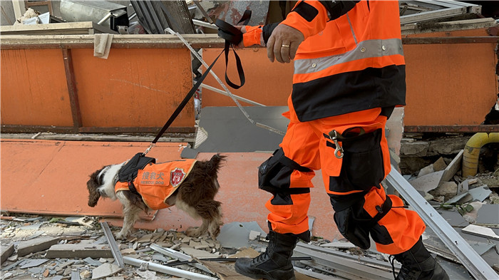 搜救隊員與搜救犬Lucky在救援現(xiàn)場。公羊救援隊供圖