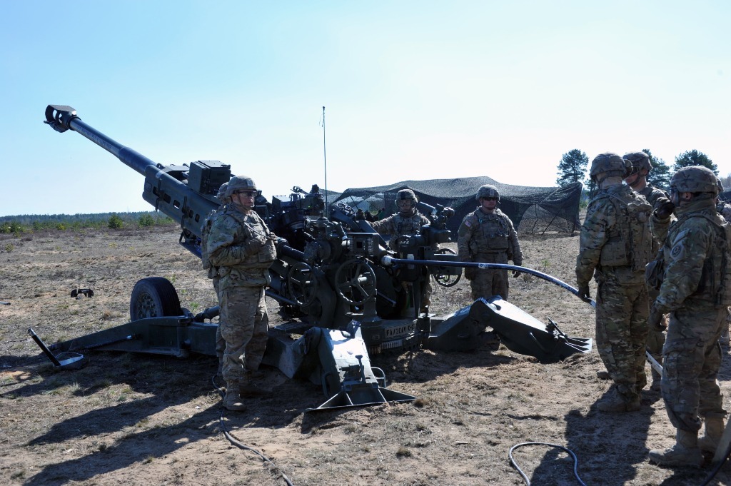 2016年4月28日,在拉脫維亞阿達(dá)日軍事基地訓(xùn)練場,美軍炮兵進(jìn)行射擊準(zhǔn)備。新華社記者郭群攝