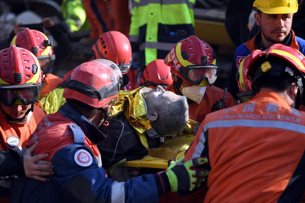 2月12日,在土耳其哈塔伊省安塔基亞市,中國救援隊(duì)轉(zhuǎn)移一名救出的幸存者。新華社記者沙達(dá)提攝