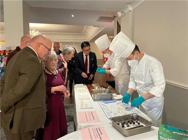 活動(dòng)現(xiàn)場(chǎng),中國(guó)駐英使館王起公參、李立言公參借助視頻等介紹了中國(guó)春節(jié)的文化習(xí)俗、展示了浙江省舟山市的嶄新面貌和巨大變化?,F(xiàn)場(chǎng)安排了豐富多彩的節(jié)目,包括河北省非物質(zhì)文化遺產(chǎn)“辛集農(nóng)民畫”春節(jié)習(xí)俗展、中國(guó)民樂(lè)文藝表演,以及畫扇、茶藝、包餃子、滾湯圓等中國(guó)傳統(tǒng)文化體驗(yàn)活動(dòng)。