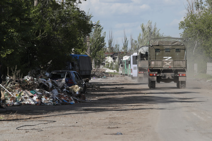 2022年5月20日,載著烏克蘭武裝人員的巴士駛離馬里烏波爾。俄羅斯國防部發(fā)言人科納申科夫當(dāng)天說,俄武裝部隊(duì)已經(jīng)完全控制馬里烏波爾亞速鋼鐵廠的地下設(shè)施。新華社發(fā)(維克托攝)