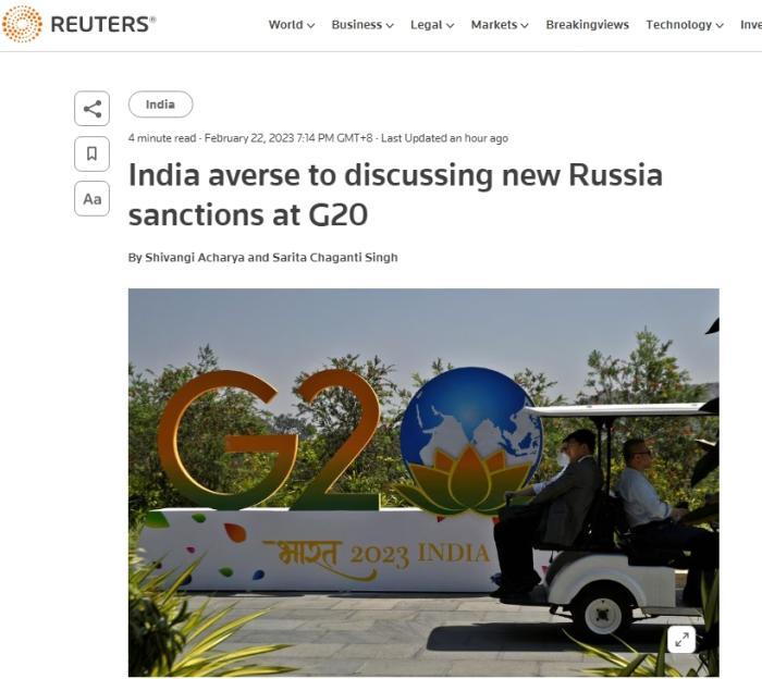 中新網(wǎng)2月22日電 據(jù)路透社22日援引印度政府高級官員消息稱,印度不希望在其擔(dān)任G20輪值主席國的一年里,討論對俄實施額外制裁的問題。