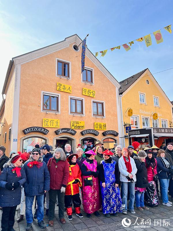 節(jié)日期間的迪特福特,隨處可見中國文化元素。主街兩側的房屋上,懸掛著“祝你生活愉快““華人你好嗎”等漢語招牌,街道上方則拉起了彩旗和紅燈籠;市政廳前不但搭起巨大的中式戲臺,平時經(jīng)營德國風味的面包店和肉店,也都把招牌換成了“中國面包店”“中國肉店”,并張貼著“?!薄暗摗薄皦邸钡燃橛谜Z,游客在攤位前排起長龍,津津有味地吃著“中國甜甜圈”。