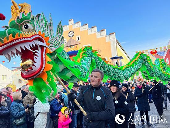 他們有的穿著自行設計的旗袍馬褂,邊走邊向觀眾分發(fā)糖果和熱紅酒;當?shù)毓軜逢牬┲B(tài)可掬的熊貓服裝,吹奏起巴伐利亞民歌;由當?shù)厣鐖F組成的舞龍隊,吸引了很多小朋友的注意,領頭的德國大叔還把龍頭放低,跟小朋友親切互動;由旅德華人組成的華星藝術團方陣,憑借各色中國民族服裝展示,贏得了觀眾的熱烈掌聲。