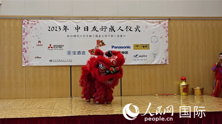 今年約有140位18至22歲的中日青年來(lái)到成人儀式現(xiàn)場(chǎng)。儀式中不僅舉行了日本傳統(tǒng)的鏡開(kāi)儀式(即用木槌敲開(kāi)清酒酒桶的蓋子,祈愿“開(kāi)運(yùn)”),BJBJ樂(lè)團(tuán)的演奏和中國(guó)傳統(tǒng)的舞獅表演更是將氣氛推向了高潮。