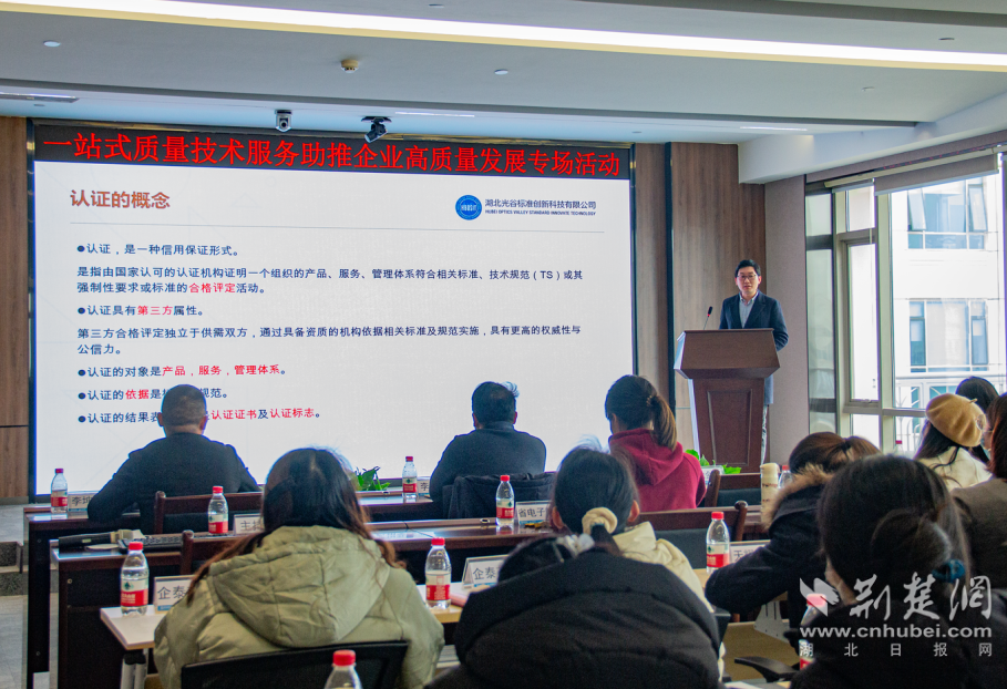 “標(biāo)準(zhǔn)對于規(guī)范企業(yè)發(fā)展非常重要,而認(rèn)證對于企業(yè)開展市場交易活動(dòng)的作用也很關(guān)鍵“,湖北光谷標(biāo)準(zhǔn)創(chuàng)新科技有限公司認(rèn)證事業(yè)部負(fù)責(zé)人余毅向與會企業(yè)代表普及了《認(rèn)證基礎(chǔ)知識》。他表示,認(rèn)證起源于市場、服務(wù)于市場、發(fā)展于市場,廣泛存在于產(chǎn)品和服務(wù)等市場交易活動(dòng)之中,能夠在市場中傳遞權(quán)威可靠信息,建立市場信任機(jī)制,引導(dǎo)市場優(yōu)勝劣汰。市場主體采用認(rèn)證手段,可以實(shí)現(xiàn)互信互認(rèn),打破市場和行業(yè)壁壘,促進(jìn)貿(mào)易便利化,減少制度性交易成本。隨后,他詳細(xì)介紹了認(rèn)證工作的各項(xiàng)流程,并表示企業(yè)如果有需要,光標(biāo)公司可以圍繞認(rèn)證提供全方位服務(wù)。