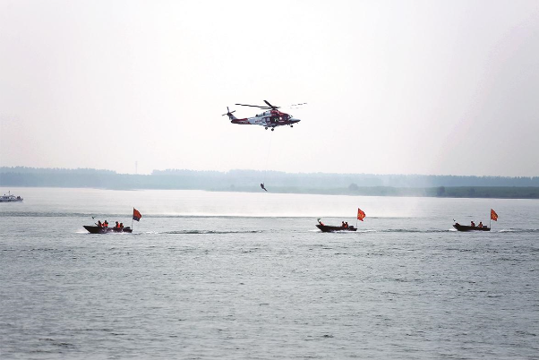 石首長(zhǎng)江防汛搶險(xiǎn)綜合演練,開(kāi)展直升機(jī)水域救援。