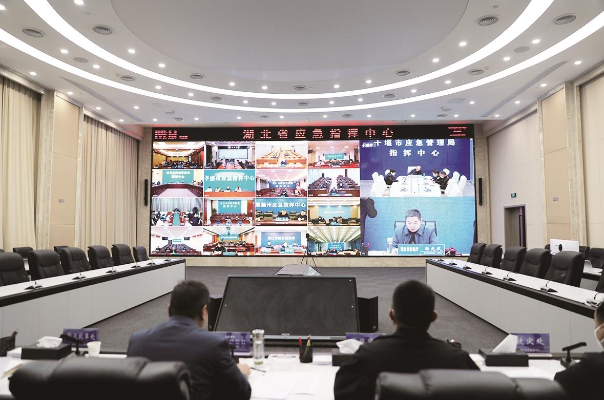湖北省應(yīng)急管理廳應(yīng)急指揮中心,通過(guò)視頻連線(xiàn)各級(jí)應(yīng)急指揮中心和救援隊(duì)伍。