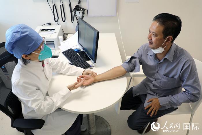 | 在考斯瑪中柬友誼醫(yī)院的中醫(yī)門診內(nèi),中國援柬中醫(yī)抗疫專家組組長樊茂蓉正在為一名柬埔寨病人把脈診斷。人民網(wǎng)記者 趙益普攝 |