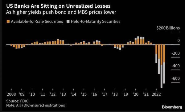彭博數(shù)據(jù)顯示,美國銀行在短短數(shù)日內(nèi)吸收了超過150億美元新存款,成為硅谷銀行等三家美國規(guī)模較小的銀行倒閉后最大的贏家之一。由于擔(dān)心危機蔓延,尋求避險的儲戶紛紛涌向被視為“大到不能倒”(too big to fail)的一些大銀行。接近美國銀行的人士對記者表示:“在目前的情況下,銀行并不會因為獲得大量存款而感到高興,以前還可以進行同業(yè)拆借來將資金融出,現(xiàn)在同業(yè)的流動性情況都差強人意,因而只能投資美債,但目前美債的情況亦充滿不確定性。”FDIC數(shù)據(jù)顯示,據(jù)估算,截至去年底,所有美國銀行的可供出售和持有至到期的投資組合未實現(xiàn)虧損總計為6200億美元。
